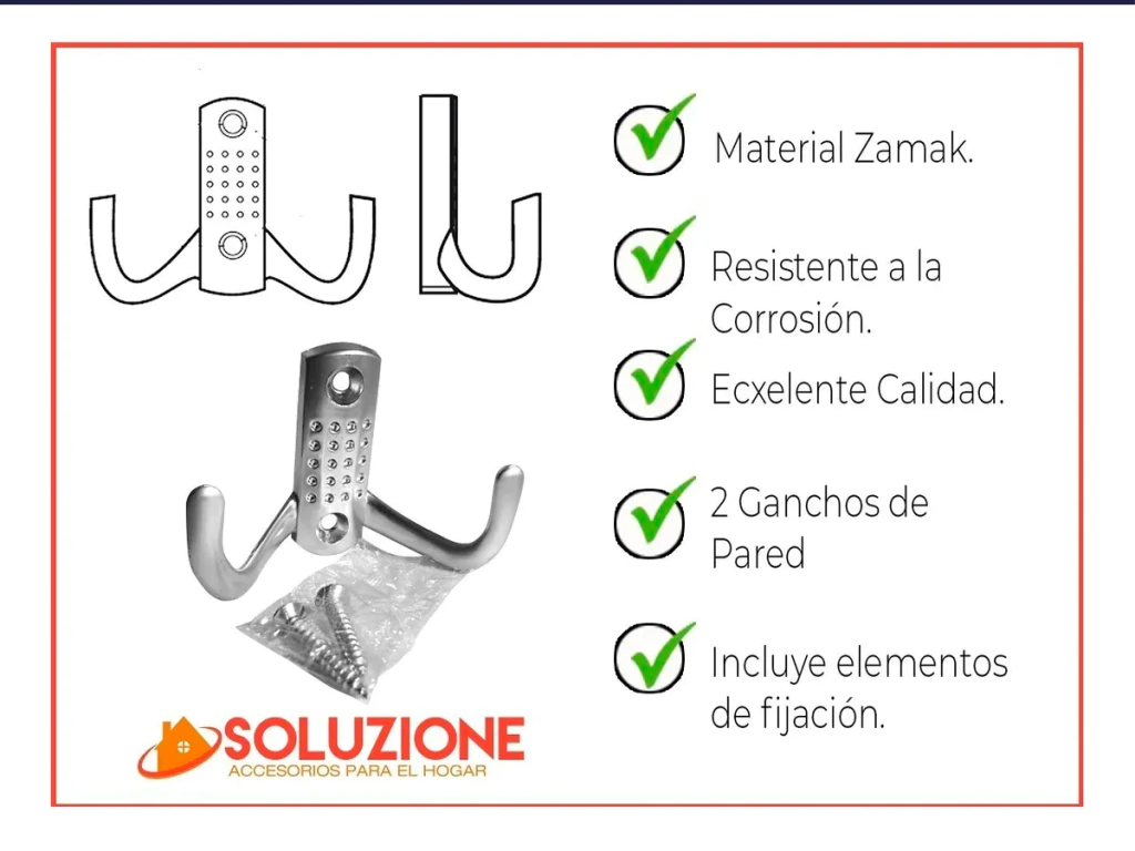 Percha Zamac Cromo Mate 2 Ganchos Grande Doble Hogar.