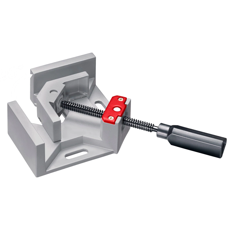 Auxiliar de montaje, también para distintos grosores del material, para trabajos rápidos y sencillos, sujeta todos los materiales, gracias a la posición girable del husillo y de las mordazas, también con distintos grosores al mismo tiempo en ángulo recto, para encolar, atornillar, etc.